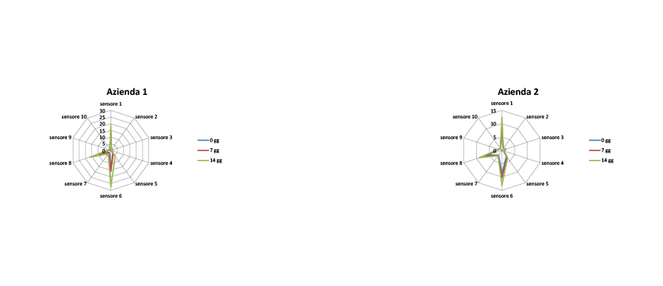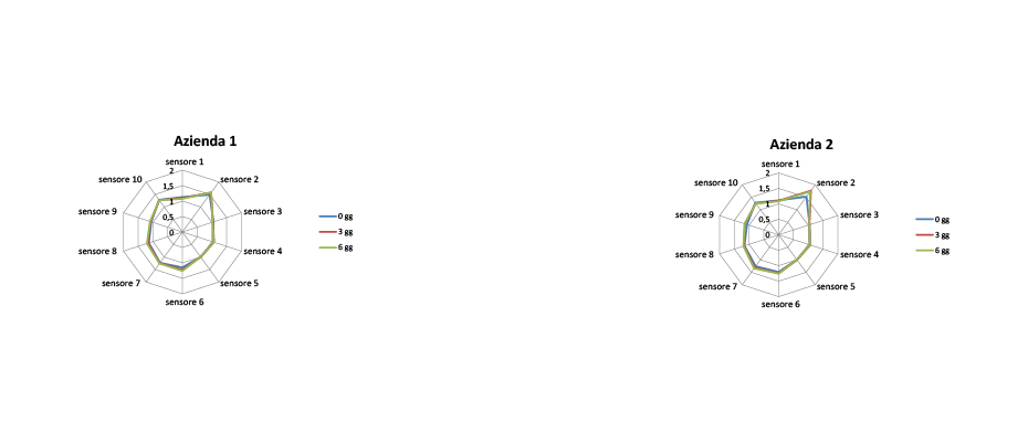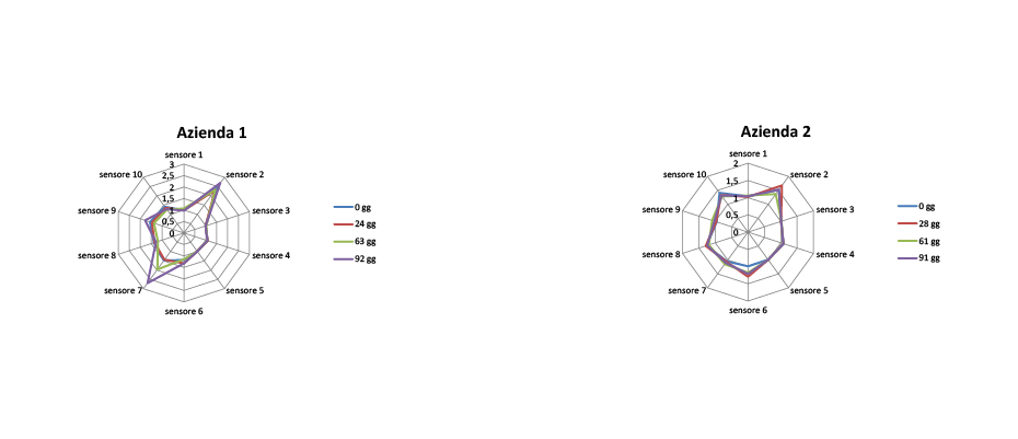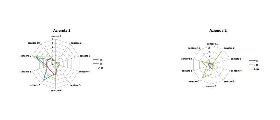 Molto diverso invece il profilo dei due prodotti. Quello dell’Azienda 1 risulta irregolare con valori molto elevati per due sensori, il 2 ed il 7. Nel caso dell’Azienda 2 il profilo è più regolare con intensità molto bassa per tutti i sensori. Tali differenze attengono alle iniziali scelte aziendali e non sono influenzate dalla conservazione.