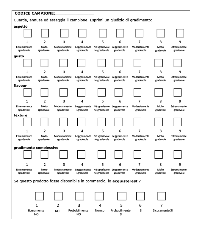 Figura 5 – Scheda utilizzata per la valutazione del gradimento e della propensione all’acquisto dei prodotti in esame.