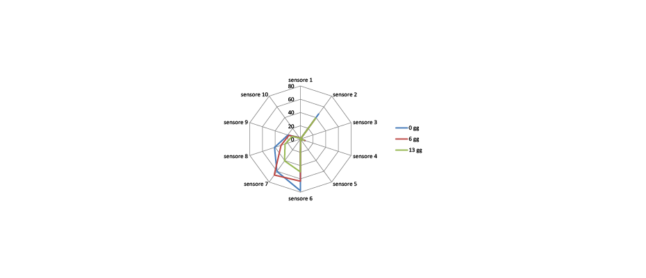 Questa costanza sembra non trovare conferma dal punto di vista della frazione volatile valutata mediante il naso elettronico (Figura 9), ma occorre precisare che per questo prodotto la valutazione è stata fatta direttamente sulla confezione e quindi potrebbe risentire di modificazioni sulla misura indotte dall’atmosfera di conservazione e/o dal polimero utilizzato per il packaging.